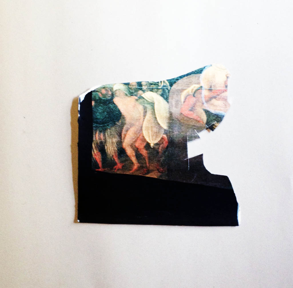 Ich nehme ein Teil aus der Masse heraus, betrachte es genauer:  Schnitte, Einschnitte, auch Reißstellen. Und Teil eines aufgeklebten Bildes von Hieronymus Bosch, so meine ich zu erkennen. Jürgen hat mir erzählt: das Material stammt ursprünglich vom inzwischen verstorbenen Künstler Peter Maschke. Jürgen schrieb mir dazu: „Die Papiere, die ich fuer die Scherenschnitte verwendet habe, waren von ihm schwarz übermalt und mit farbigen Kopien beklebt worden. Handschriftliche Textstellen aus diversen Büchern  waren eingefügt. Sie lagen jahrelang in seiner Materialecke und warteten auf irgendetwas. Aber was?“ So viel Wollen, so viel Geschichte steckt in diesen Schnipseln. Wie werde ich damit umgehen können?