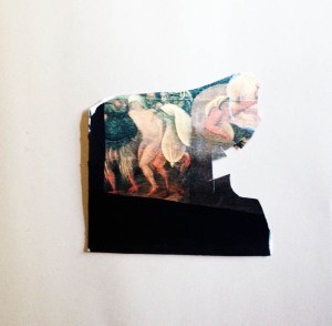 Meine erste Reaktion ist: ich muss die Geschichte unkenntlich machen, vielleicht sogar ganz auslöschen, um eigenes daraus zu formen. Ich versuche es auf einer quadratischen grauen Fläche 50 x 50 cm mit ein paar willkürlich herausgegriffenen Teilen, die ich dicht zusammen, teilweise auch übereinander lege. Aber überall spritzt mir Bildhaftes entgegen, das sich nicht integrieren, sondern seine eigene Stimme behalten, seine eigene Geschichte erzählen will.