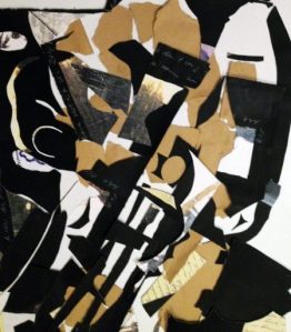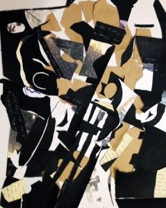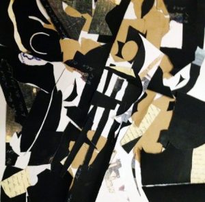Durch den Zusatz des bräunlichen Umschlagpapiers zu Jürgens Schnipseln ist eine Farbskala entstanden, die mich sehr an die Kubisten – und hier besonders an Braque – erinnert. Meine große Komposition mit Violine und Krug zeigt das, denke ich mal, auch wenn Braque niemals viel Schwarz verwendete.