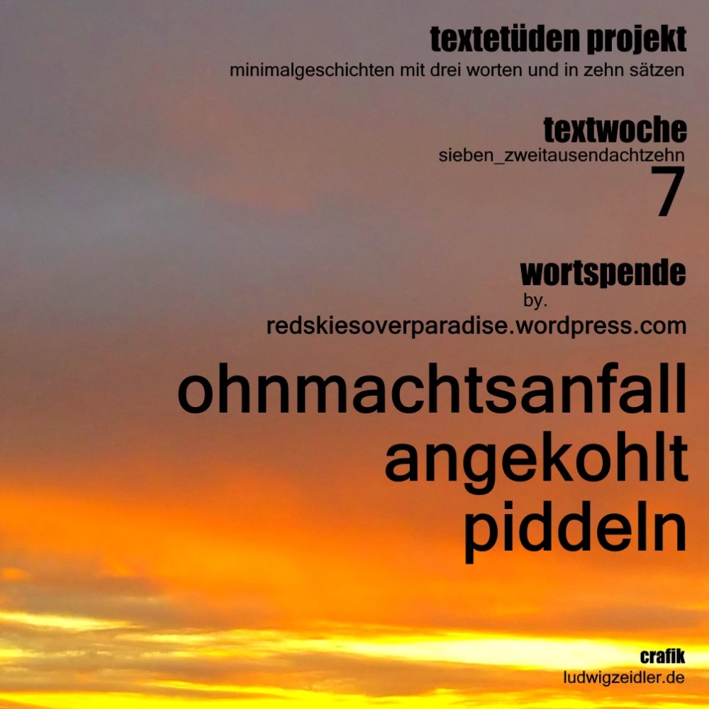 Noch ne üble Kata-Strophe zu den dies-wöchentlichen Wörtern gefällig? als da sind: angekohlt, piddeln und Ohnmachtsanfall. Eingebrockt hat uns diese Wörter Bernd von redskiesoverparadise.name. Christiane hat unsere Übungen mal wieder großherzig betreut, und lz hat unsere Schreibwut mit einer feurigen Abendstimmung angeheizt.