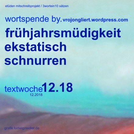 Gefragt ist, ein Kleinst-Oeuvre aus höchstens zehn Sätzen zu fabrizieren mit den Wörtern schnurren, ekstatisch und Frühjahrsmüdigkeit, die vrojongliert diesmal gespendet hat. Die Einladung gestaltete wie immer lz. Danke, Christiane, für die liebevolle Betreuung dieser unserer literarischen Bemühungen.