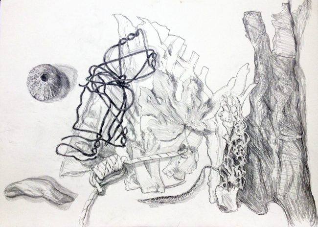 ← Palmstammschuppen, Knochen, Quitte und Schlangenholz (Bleistiftzeichnung)