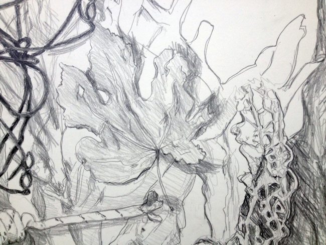 Palmstammschuppen, Knochen, Quitte und Schlangenholz (Bleistiftzeichnung)