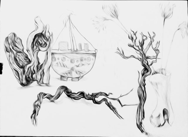← Origanon und andere Hölzer, Knochenvase, Keramikboot (Bleistiftzeichnung)
