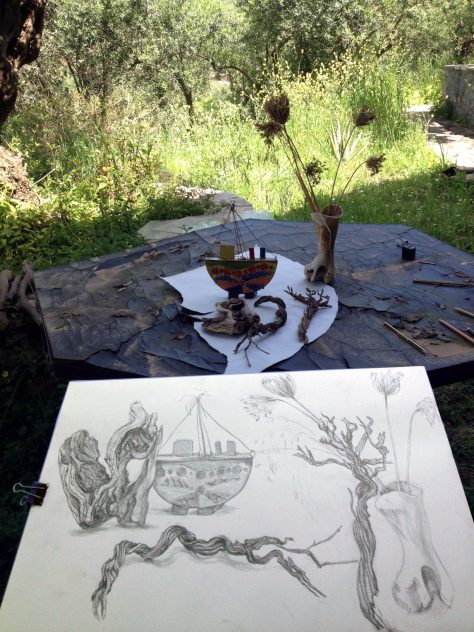 ← Origanon und andere Hölzer, Knochenvase, Keramikboot (Bleistiftzeichnung)