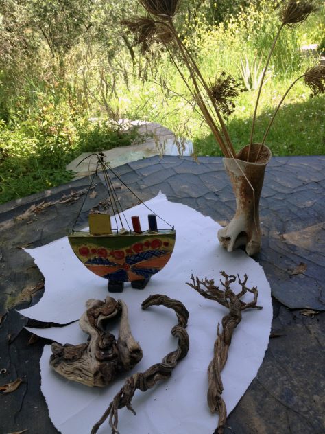 Origanon und andere Hölzer, Knochenvase, Keramikboot (Bleistiftzeichnung)