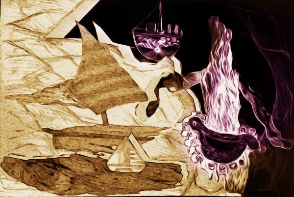 Holz, Boote, Holzrassel mit Glöckchen (Bleistiftzeichnung)