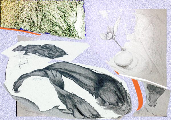 ← große Palmstammschuppe, Schwemmholz, Borkenstück und weiße Keramikvase mit Kunstblume (Bleistiftzeichnung)