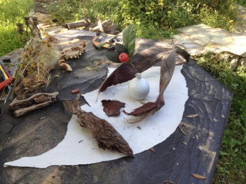 ← große Palmstammschuppe, Schwemmholz, Borkenstück und weiße Keramikvase mit Kunstblume (Bleistiftzeichnung)