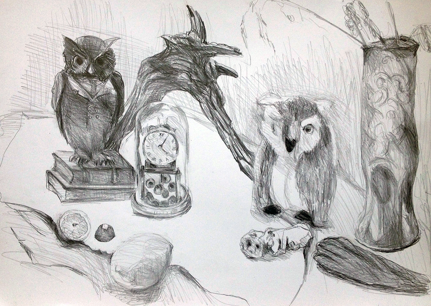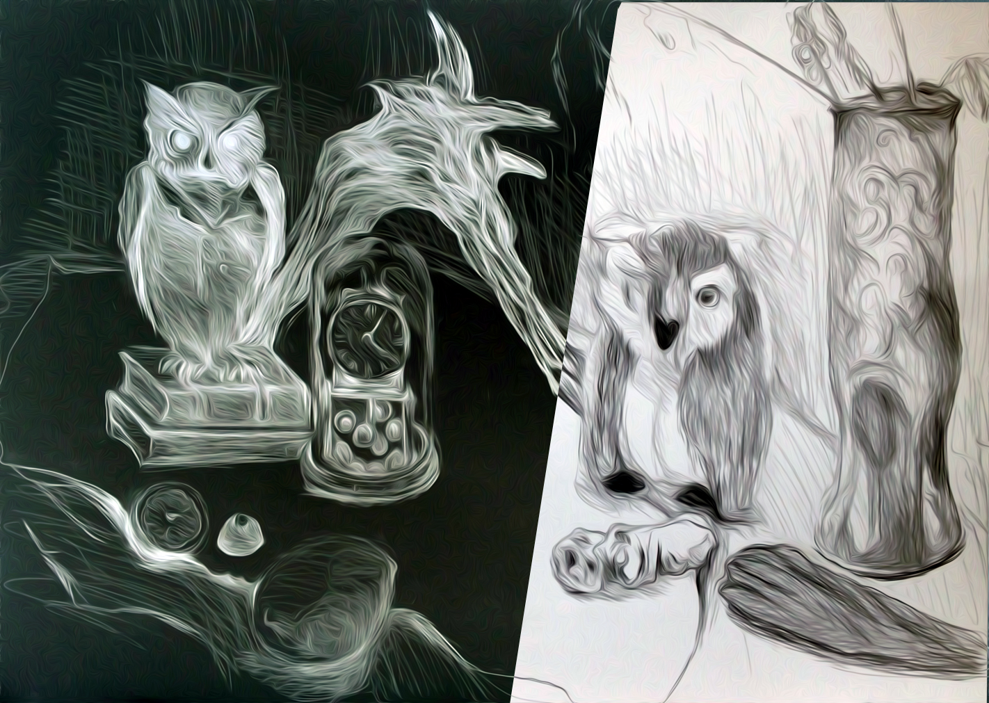 Mit deinen Bleistiftzeichnungen schaffst du etwas ganz faszinierend Eigenes, wie ich es so noch nicht gesehen habe. Besonders diese beiden Bilder habe ich lange angeschaut, weil sie mich ganz besonders ansprechen, vielleicht wegen der symbolträchtigen Modelle, der einäugigen Eule, erst alles einzeln und doch verbunden und im 2. Bild durch Tag und Nacht getrennt? Chapeau!