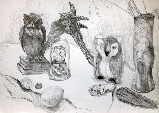 Wieder ein interessantes Stillleben. Die Büchereule gefällt mir sehr. Eine Eule aus Kaninchenfell ist herrlich schräg (analog zu Wolf im Schafspelz?), und die Uhr unter dem Glassturz… ich kann solche Uhren leider nicht mehr sehen, ohne wütend und traurig zugleich zu werden, weil ich um eine solche Uhr, die auch ein besonderes Erinnerungsstück war, vor vielen Jahren in gemeinster Weise betrogen wurde.
