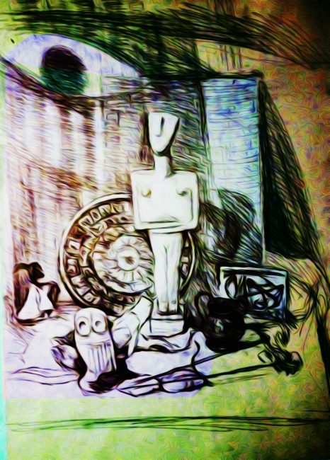 Kykladische Göttin, Athenische Eule, Klees Ruderer, Zinnkännchen, Brettspiel aus Ravenna, Boot, Denker und Schattenwürfe (Bleistiftzeichnung)