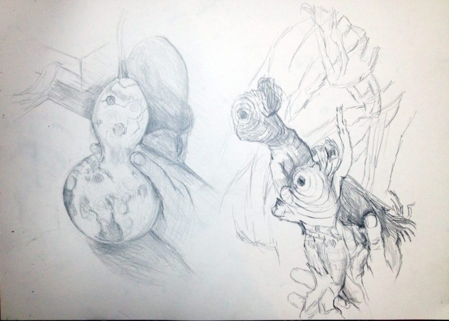 Zeichnungen des ersten Quartals 2018 im Überblick (1) „Naturwesen: Schilfwurzeln und Madame Kolokytha“.