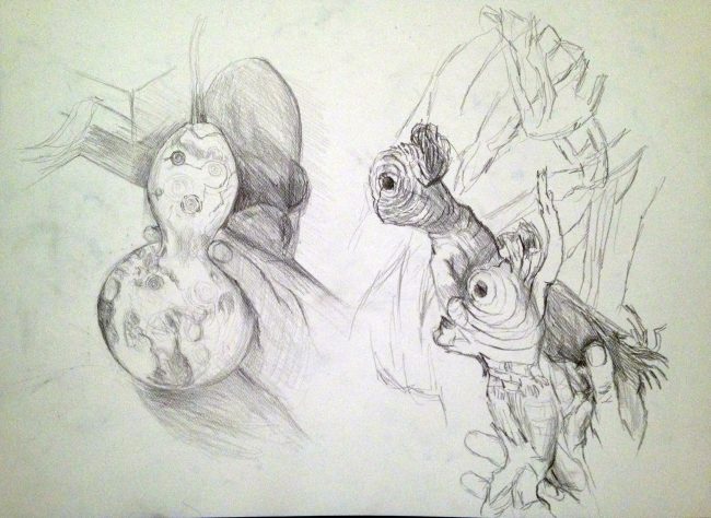 Zeichnungen des ersten Quartals 2018 im Überblick (1) „Naturwesen: Schilfwurzeln und Madame Kolokytha“.