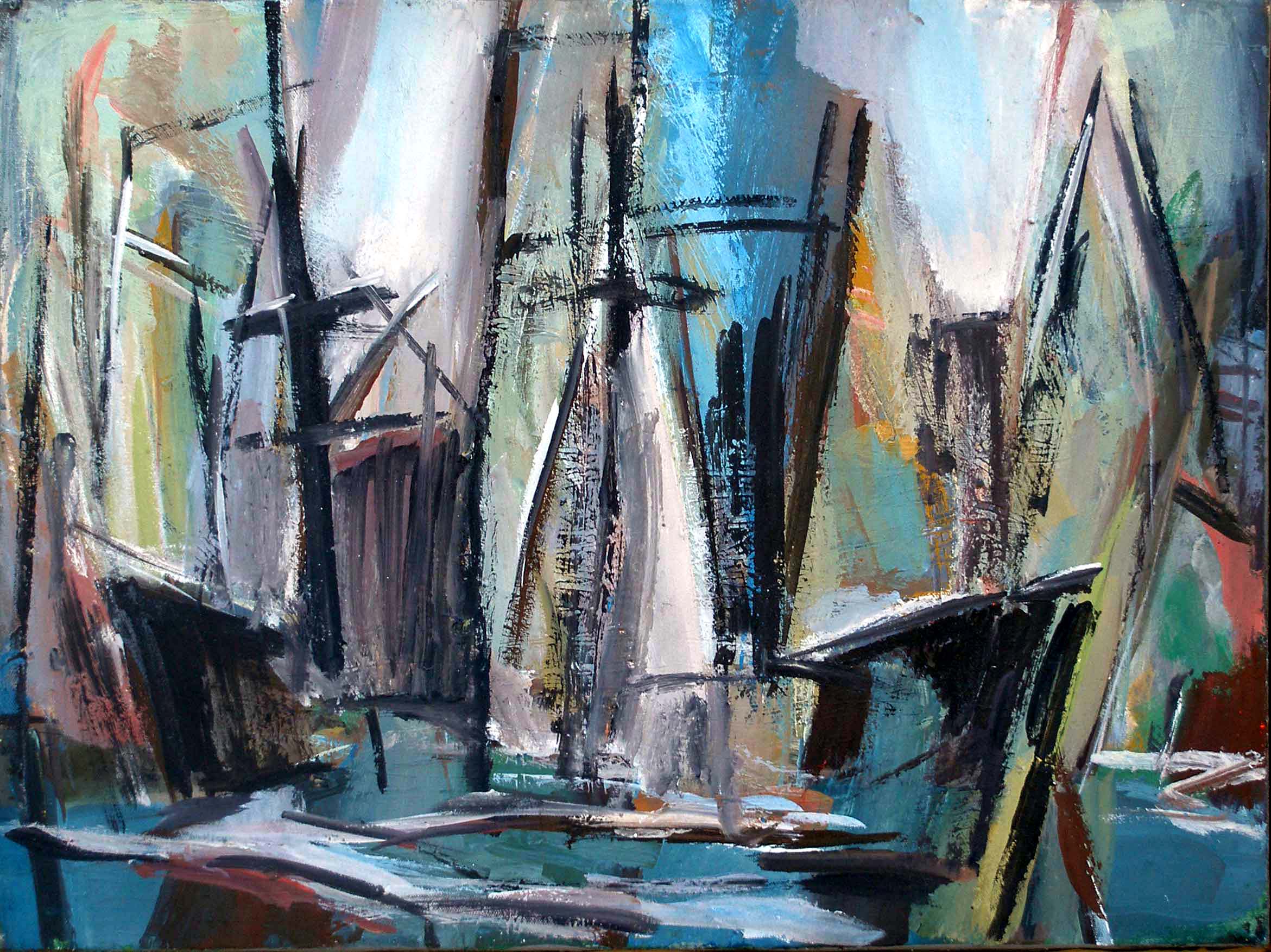 Dieses Bild soll mein letzter Beitrag für Ullis Blogparade „Boote“ sein. Ich malte es 2008 mit Akryllpigmenten und Kleister auf Leinwand, 50×60 cm.