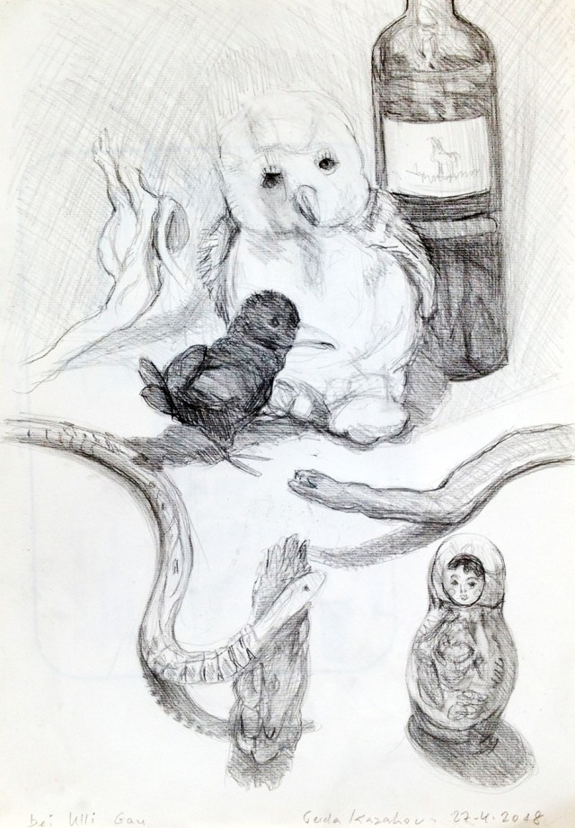 In Ullis Wohnung fanden sich natürlich auch Dinge zum Abzeichnen : eine plüschige Schneeeule und ein rotschnabeliger borstiger Rabe, eine hölzerne Schange und ein Schlangenholz, zwei andere Hölzer und eine russische Matruschka und ja, eine Flasche Rotwein war auch vorhanden.