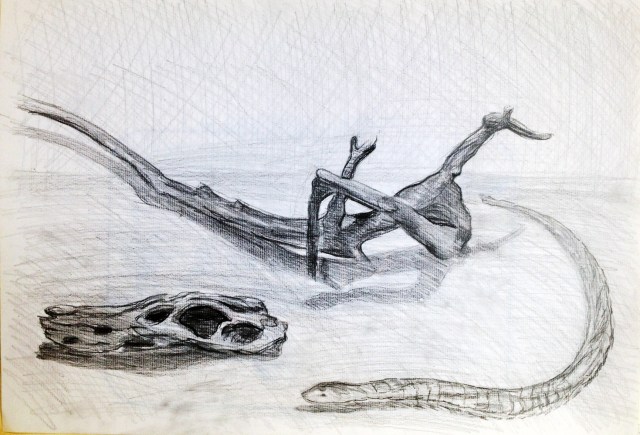 Eines der Hölzer hatte eine ganz besondere Gestalt und Geschichte, das musste ich auch noch zeichnen (hinten) – zusammen mit einem Holz-Mitbringsel aus Griechenland (vorn) und der hölzernen Schlange.