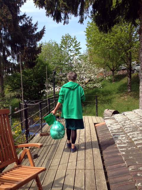 Die Hausherrin ging Müll wegtragen und das Hausschwein füttern.