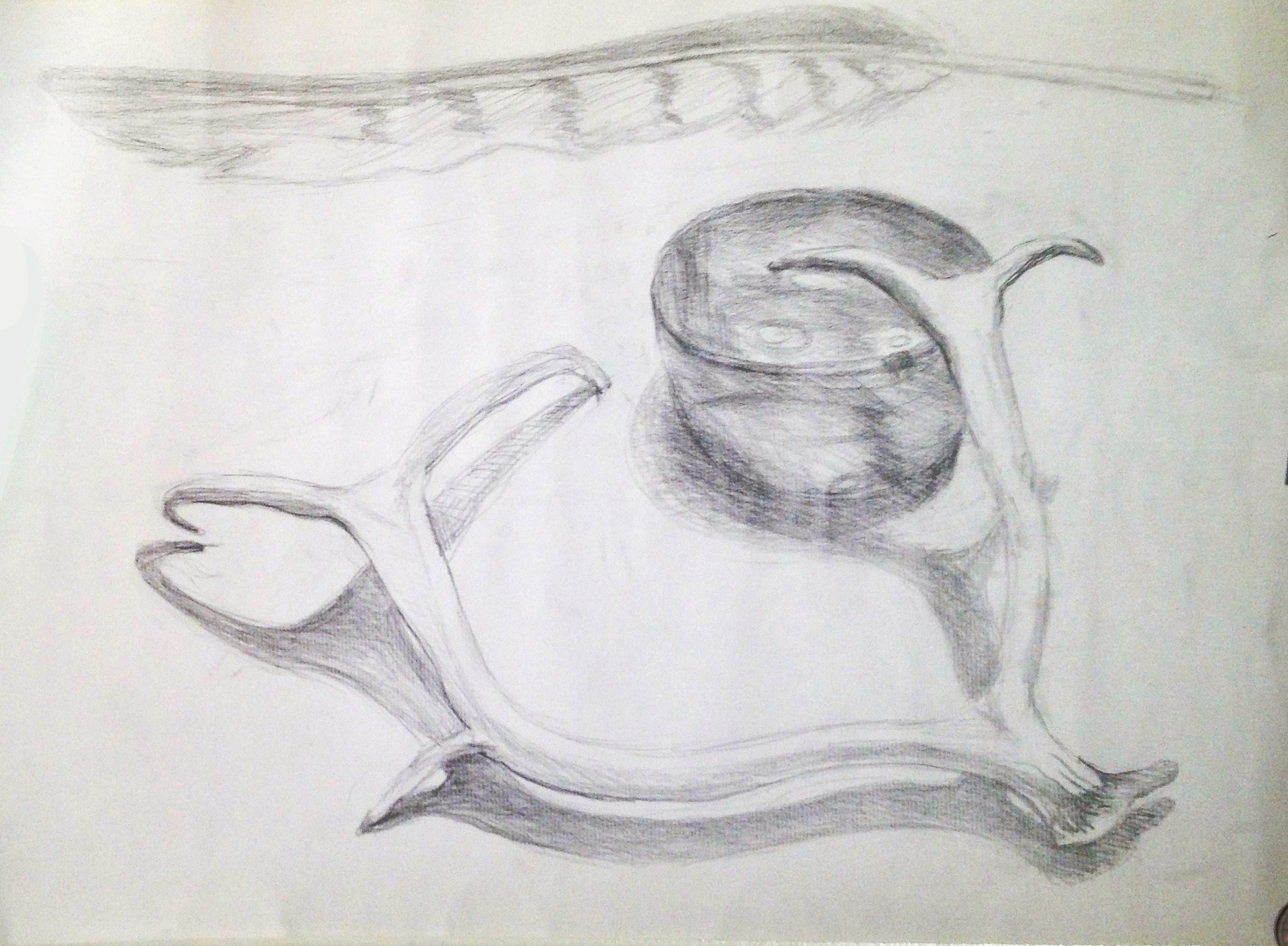 Schließlich fanden das Geweih eines jungen Rentiers, eine Klangschale und die Feder eines Roten Milan (Gabelweihe, Königsweihe) auf einer Zeichnung zusammen.