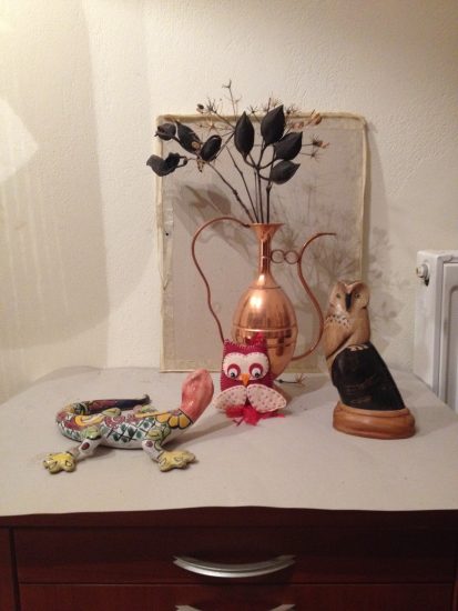 Konferenz: Vase aus Simbabwe, Eule aus Hamburg, Echse aus Mexiko (Bleistiftzeichung)