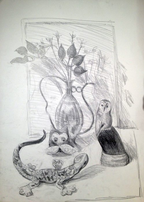 ← Konferenz: Vase aus Simbabwe, Eule aus Hamburg, Echse aus Mexiko (Bleistiftzeichung)
