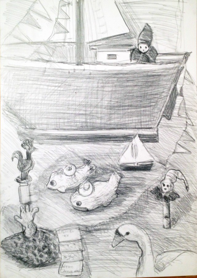 Sooo eine hohe Reling für so einen kleinen Kerl. Aber ihm gehts gut, ich sehe es ihm deutlich an, aber daß er eine von Ferne Angebetete allzu salopp Pfeifenkopp nennt, das verblüfft mich jetzt schon. Sollte es nicht ein liebevollerer Name sein, oder wenigstens ein Pfeifenköpfchen, denke ich noch, und siehe da, das Köpfchen ist schon da 🙂 Ich bin gespannt, was der Kleine noch erleben wird auf dem großen Schiff auf hoher See und stürmischem Wellengang, aber vielleicht wird er auch ein Weilchen an Land gehen, um neue Länder zu erkunden… wer weiß, nur er und selbstverständlich Gerda