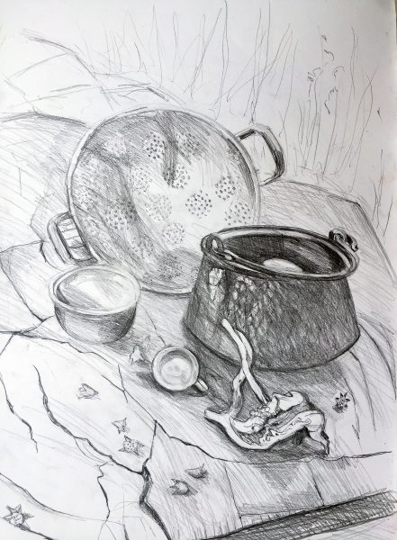 ← Blech-Sieb, metallener Blumenübertopf, Keramikschälchen, Kaffeetässchen aus Porzellan, Holz und Granatapfelblüten (Bleistiftzeichung)