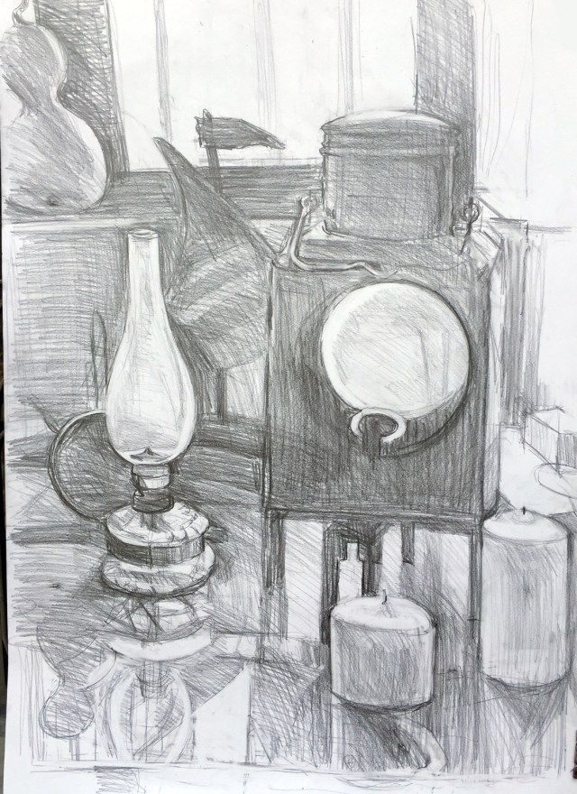 Die Lampenzeichnerin zeichnet auch das Schwierige, sich Spiegelnde, und trägt immer neue Konstellationen zusammen, was mir auch gefällt. Lichtquellenstilleben. Es leuchtet auch ohne Flammen!