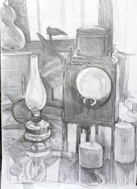 ← Lichtquellen im Gegenlicht, mit Schatten und Spiegelung (Bleistiftzeichnung)
