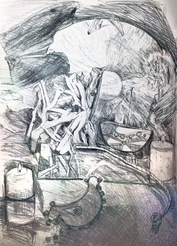 Mit Gong und Rassel (Bleistiftzeichnung)