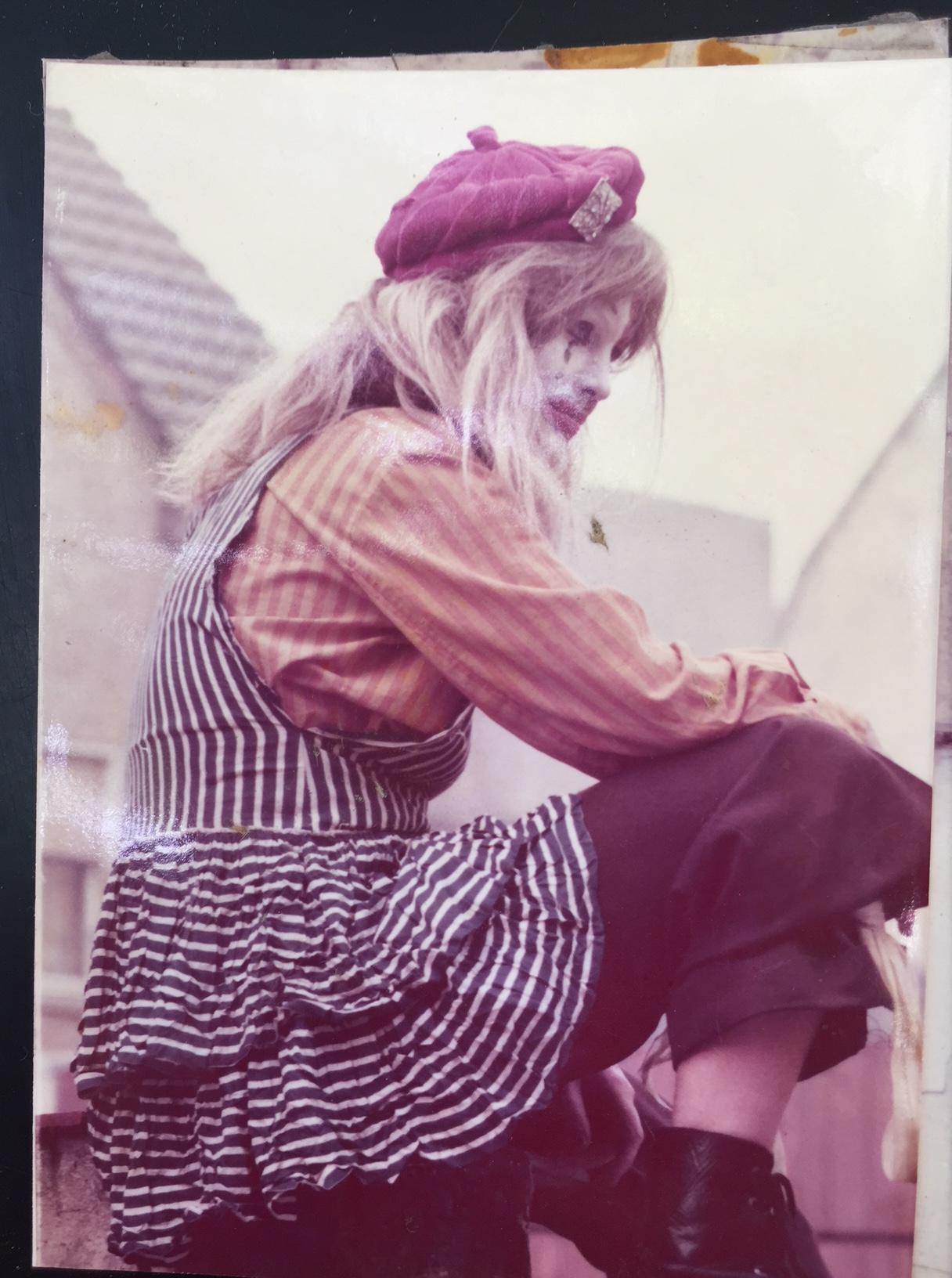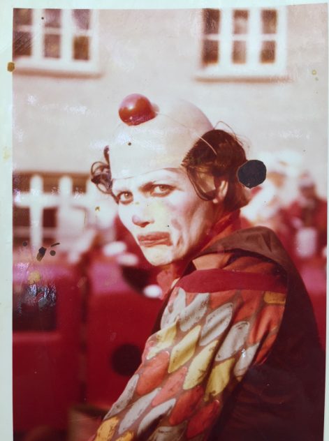 Beim Räumen fielen mir ein paar alte, schon etwas verblichene analoge Fotos in die Hände. Sie lagen stammen aus den 80er Jahren. Wir ehemaligen Kinderladen-Leute – Eltern und Kinder, später dann auch Enkel – trafen uns jährlich zum Fasching bei S. In ihrer großen Klamottentruhe fand sich stets irgendwas zum Überziehen, und Schminksachen gab es auch. Ich machte mich jedesmal zum Clown oder Pierrot. Und weil ich mir so gut darauf gefalle, zeige ich sie euch mal als digitalisierte Fotos.