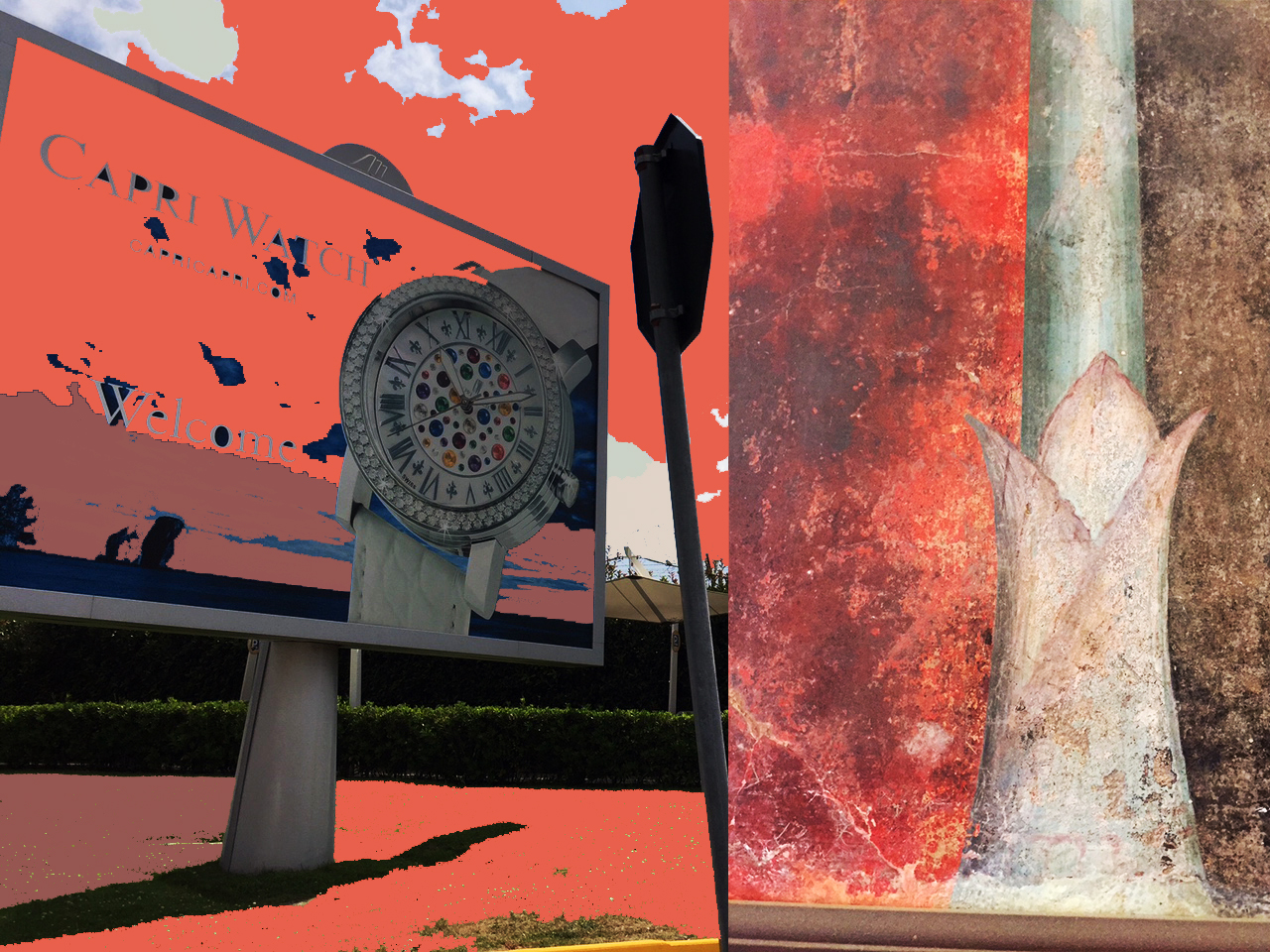 Hier habe ich zwei andere Szenen kombiniert und das unterschiedlich abgeschattete Rot sowie die anderen Farben des Wandgemäldes aufs Foto des modernen Neapel übertragen. Was bleibt?