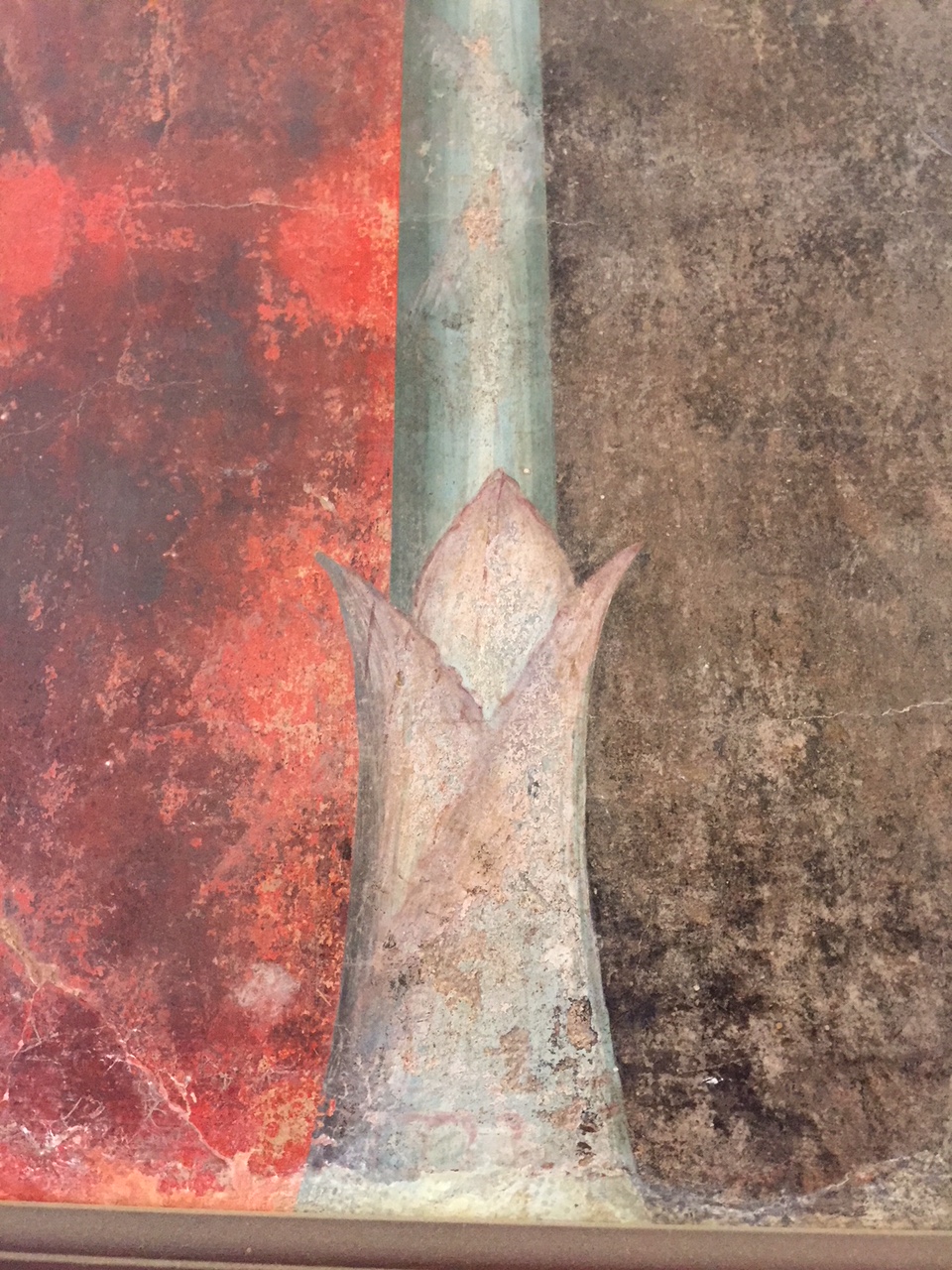 Mir ist in diesem Zusammenhang besonders wichtig, das Verhältnis von Natur- und Menschenwerk wahrzunehmen – und wie dieses dann von den ganz und gar unbeherrschbaren Vulkankräften noch einmal überformt wurde. Es ist dieses Nacheinander von kleinen menschen-gesteuerten Verfahren und der überwältigenden Naturkraft, die mich im fFall des pompejischen Rot fasziniert. Ähnliches empfindet man sicher bei den Städten der Maya, die vom Dschungel zurückgeholt wurden, oder bei der Unterwasser-Archäologie, wenn man Skulpturen und Amphoren ans Licht bringt, die vollkommen von Muschelkalk überwuchert sind.