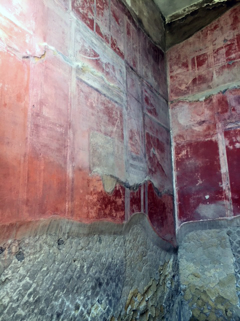 Ursprünglich glaubte man, dass es sich bei all den Rotschattierungen in Pompeji und Herkulanum um ein und dieselbe Farbe handele. Doch inzwischen weiß man, dass es in den weitaus meisten Fällen kein Rot, sondern ein Gelb war!!! Erst durch die beim Vulkanausbruch erzeugte Hitze wurde das gelbe Pigment Terra di Siena natur zum roten Eisenoxyd! Der Tod bringende Lava-Brand hat den gelb-ockrigen Lehm in das leuchtende Rot des Vertrauens, der Liebe verwandelt. Mysterium der Transformation.