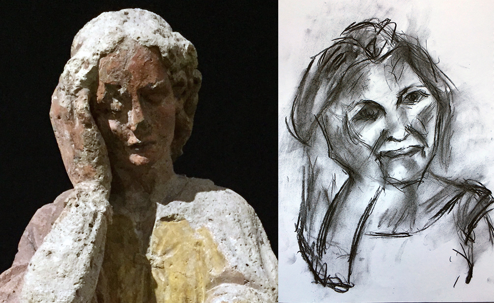 Merkwürdig, die Madonna kommt mir jetzt, beim Betrachten, irgendwie bekannt vor. Nahm ich nicht genau diese Haltung ein, letztens, als Magda mich zeichnete? Manche Haltungen wie die des/der Nachdenklichen mit aufgestützem Kopf sind, scheints, unsterblich.