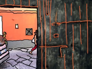 Christiane: Das zweite Bild ist mir zu statisch, obwohl ich den Kontrast mag, allerdings hätte ich versucht, es anders aufzuteilen und hätte an der Wand das Plakat und dieses rote Kästchen herausgenommen….Ich bin für das erste Bild, wobei ich anders geschnitten hätte, das Auto und das Grün weg, oben was ab (eher wie Bild 2) und bestimmt das Plakat raus. Das rote Ding hätte ich vermutlich gelassen, es unterstützt optisch die fallende Linie.