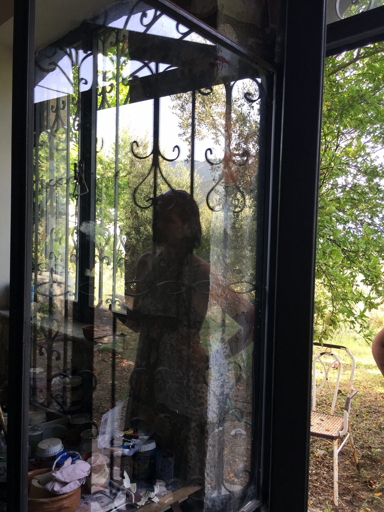 Wie dunkel sie ist! Es ist wohl der Schatten des Fenstertür-Rahmens, der dort in der Luft schwebt und das είδωλο (Idol, Scheinbild) meiner Freundin verschluckt. Ob das wohl auch im Leben so ist? Dass plötzlich ein Schatten aus dem Nirgendwo auf einen Freund fällt, und wir können ihn nicht mehr erkennen?