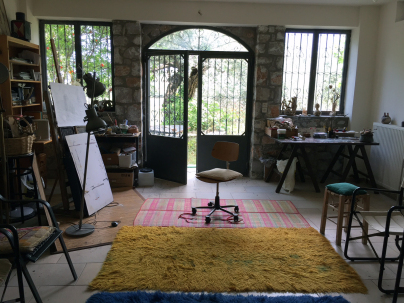 Dies ist ein Blick auf und durch meine Ateliertür. Die Tür besteht aus einer eisernen festen Platte mit Rahmen, in dessen oberen Teil eiserne Verstrebungen mit Ranken eingelassen sind, sowie aus einem frei beweglichen verglasten Eisenrahmen, der sich gesondert öffnen lässt. So kann man die Tür abschließen und dennoch Luft bekommen. In diesem Fall ist die ganze Tür nach Innen geöffnet, die Glasscheibe ist hinter den Verstrebungen befestigt, ich stehe drinnen und fotografiere von rechts nach links im Innenraum, gegen die geöffnete Fenstertür gewendet.