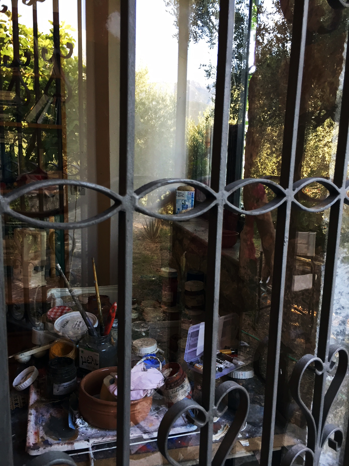 Mich fasziniert das vielschichtige Bild, das sich hinter den Verstrebungen abzeichnet. Da sind zum einen die Spiegelung des Gartens auf der Glasscheibe (… Moment mal, wieso kann der sich in der Glastür spiegeln?) und der leicht getrübte Durchblick auf die Malutensilien (Pinsel, Farben etc). Auf einer tieferen Ebene dahinter sieht man ein Fenster mit ebensolchen Verstrebungen und durch dieses Fenster hindurch einen wirklichen, also nicht-gespiegelten Abschnitt des Gartens.