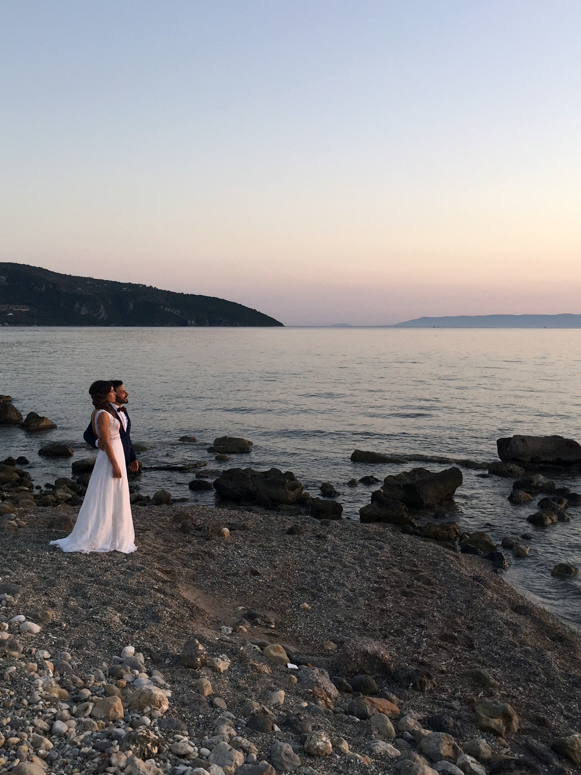 Die Braut wirkte recht energisch und bestimmend, gab Anweisungen, wusste, was zu geschehen hatte, während der Bräutigam ihr brav beim Raffen des Kleides half und sie stützte, wenn sie mit ihren feinen High Heels im schottrigen Kies des Strandes steckenblieb. Wegen des professionellen Gehabes der Frau dachte ich schon, die machen nur Fotos für ein Modejournal. Aber nein, der Bräutigam war echt, legte seine Hände weit williger um den schlanken Leib seiner Künftigen, als es die pure Professionalität verlangt hätte. So schien es mir.