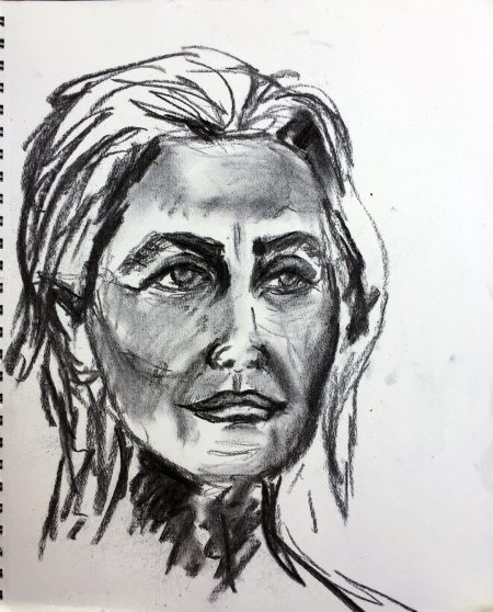 Du hast recht, es ist ein schönes Kompliment. Und ich freu mich darüber, dass Kokkonia mich so darstellt. Ihre Skizzen sind alle Komplimente an ihre Modelle, und als ich sie frage, sagte sie: wenn ich zeichne, streichle ich.