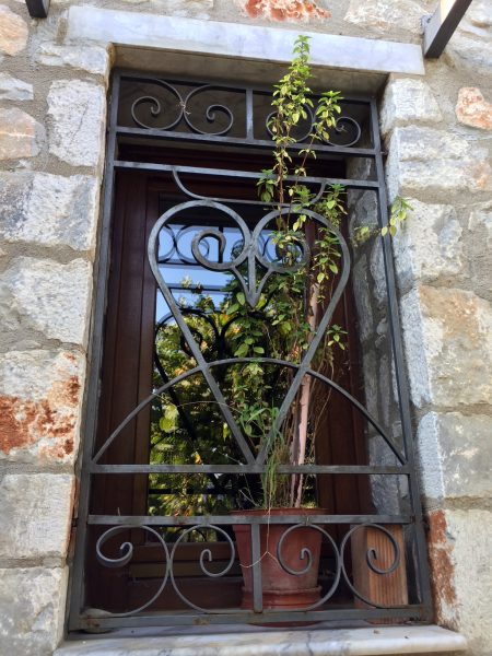(1) Blick durch die Fenster und Türen des Wohnzimmers. Unser Wohnzimmer hat acht schmale hohe Fenster. Die Form der Fenster wurde durch die Art des Baus bestimmt: die Wände sind aus 50 cm dickem Naturstein, da dürfen die Öffnungen wegen der Statik nicht zu groß sein. Außerdem sind alle mit einem Eulen-Herz-Motiv vergittert. Gitter waren notwendig, denn es kommt oft zu Einbrüchen, aber ich wollte nicht selbst in einem Gefängnis leben. Also dachte ich an eine geschwungene sich öffnende Form. Da die Eule unser Familienmotiv ist – was lag näher? Eine Freundin kritzelte einen Entwurf auf ein Papier, ich kritzelte weiter, ein Schmied war glücklich, endlich mal was Neues machen zu dürfen und passte die Zeichnung den Fenstern an.