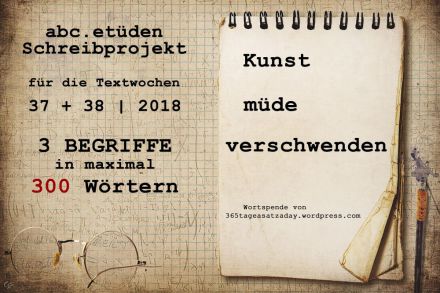 Verschwenden Kunst müde sind die drei Wörter, die Christiane uns zur neuen abc-Runde spendiert hat. Hier meine ersten Kata-Strophen dazu. 178 Wörter habe ich gezählt, statt der neuerdings erlaubten 300.