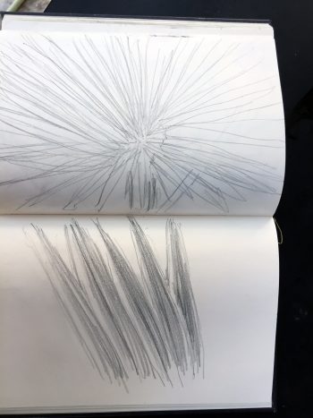 ← Skizzenbuch (7) und Blattspreite des Palmbäumchens (Fotos)