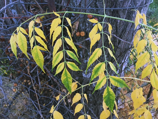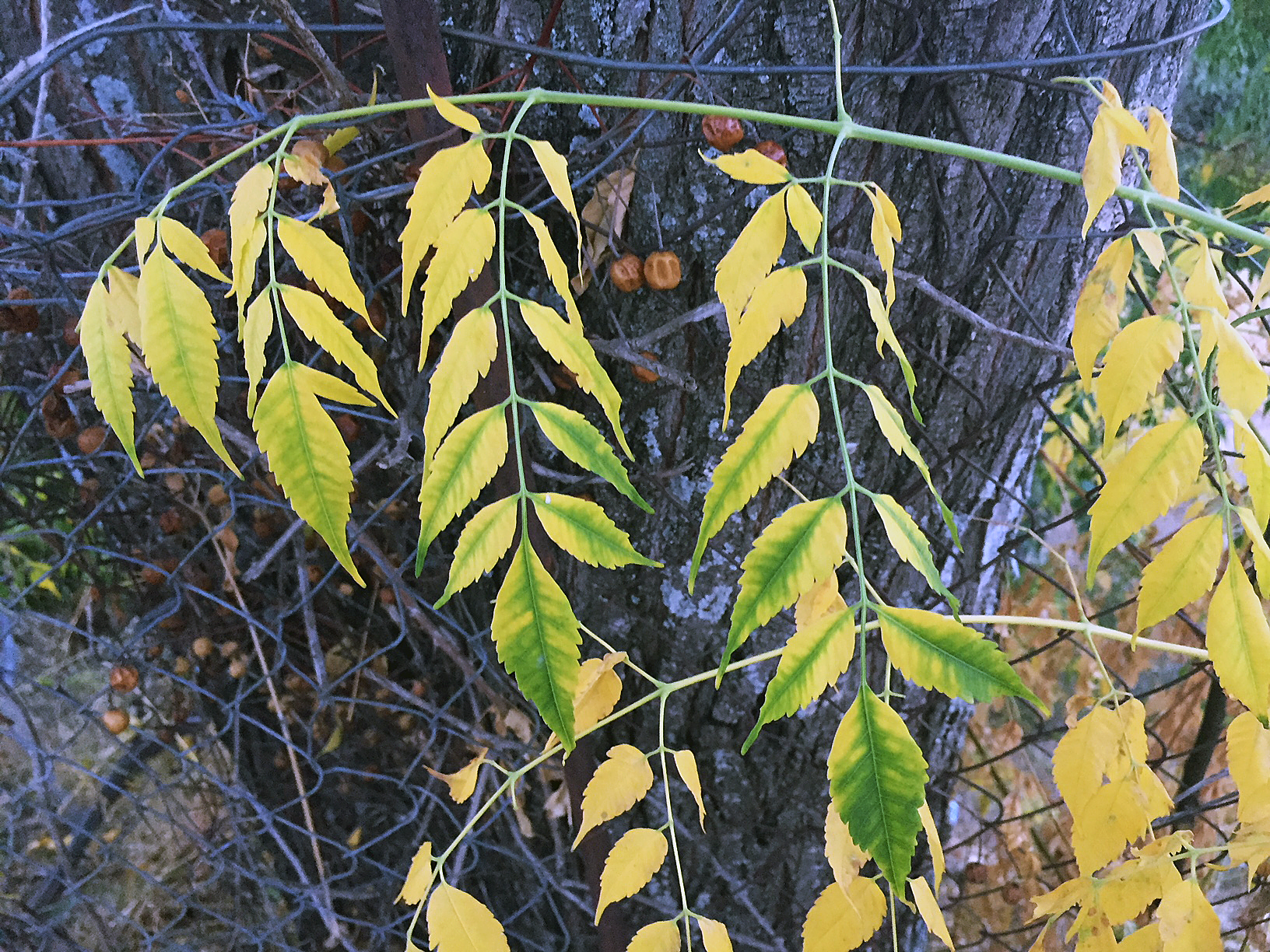 Aber gestern, beim Spazierengehen, konnte ich einem bescheidenen Bäumchen quasi dabei zusehen, wie es sein Chlorophyll zurücknimmt, um es im nächsten Frühling zur Verfügung zu haben, wenn es gilt, tausende von Blättern neu aufzubauen. Die Zone um die Sprossachse und die Adern ist noch ziemlich grün, doch der Rest hat sich schon gelb verfärbt.