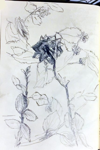 Viel Neues ist nicht entstanden. Eine verwelkende Rose in einem Blumenkasten, ein Schattenwurf von Pflanzen an der Wand, ein paar Bananenblätter zwischen Dach und Maue . Alles in der Taverne gezeichnet, bevor das Essen kam.
