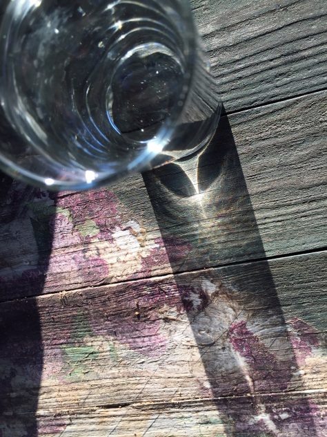 Die beiden breiten Streifen stammen von meinem Spazierstock und dessen Schatten, die im Glas eine abenteuerliche Kurve hinlegen. Die obere „Landschaft im Glas“ wird von dem Baumstamm perfekt gerahmt. Die Lichteffekte im Sockel des Glases und auf der rohen Holzplatte des Tisches, zusammen mit dem Spazierstock und dessen Schatten fügen sich zu immer neuem Farb- und Formenzauber.