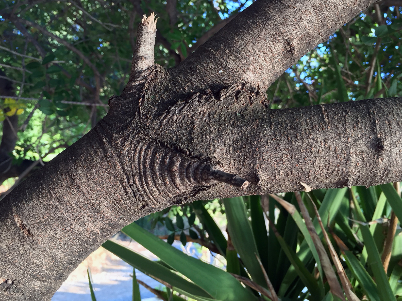 Ja, was ist das? Ich wunderte mich, als ich bei „Babis“ Kaffee trinkend den Baum betrachtete. Diese vielen Ringe, so gleichmäßig wie Wellen, wenn ein Stein ins Wasser fällt. Daneben gab es andere wulstartige Verdickungen der Borke, aber ohne diese strenge Geometrie.