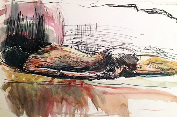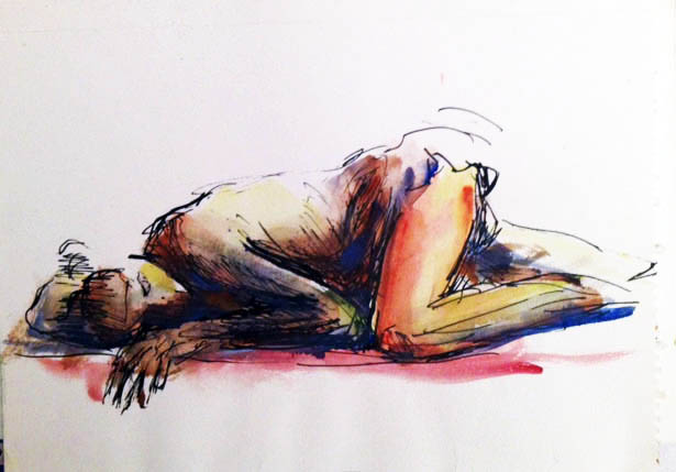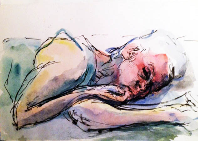 Ich habe mehrere Varianten von sommerlich gerösteten Mitmenschen. Es handelt sich um frühere Federzeichnungen mit Aquarell. Das ist erlaubt. Es ist auch erlaubt, die Zeichnungen elektronisch zu bearbeiten. Ich könnte daher auch eine Schwarz-Weiß-Version anbieten, doch finde ich in diesem Fall die Farben hilfreich, um den Eindruck des Röstens zu unterstreichen.