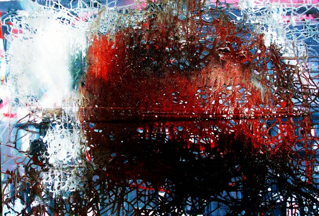 Dies Bild ist durch Gießen und Schütteln von Plastikfarbe auf einer vorbereiteten Leinwand (70 x 100) entstanden.